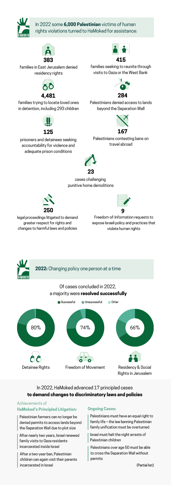 Dear friends, The day-to-day work of defending human rights is often frustrating, sometimes even heartbreaking, as we witness the suffering around us. As I write to you now, violence and collective punishments are increasing and we are all worried what the next few weeks will bring. So we take some strength and encouragement from a review of our work over the past year. In 2022, some 6,000 people turned to HaMoked for assistance, and in the majority of cases, we succeeded in helping them: locating family members in detention, enabling farmers to continue cultivating their land, reuniting families, and ensuring that people can travel freely and live in their homes without fear of deportation. You can see the full breakdown of our cases below. Alongside the individual assistance, HaMoked also works for broader changes, filing strategic litigation, supplemented with research and advocacy, in order to challenge government and military policies that violate human rights. Success is more sporadic on this level, but in 2022, we managed to overturn harsh restrictions on access to farmlands beyond the Separation Wall, benefitting thousands of farmers who were previously denied permits. We also succeeded in lifting the two-year ban on children visiting parents incarcerated inside Israel, and renewing prison visits from Gaza - both bans were arbitrarily maintained long after other Covid-19 related bans were lifted. Our principled litigation continues on a range of topics as detailed below, including our demands to end night arrests of Palestinian children and to ensure an equal right to family unification, so that Palestinian families can live together. Of course, the year ended with the election of an extremist Israeli government that is working to further entrench the occupation and the de-facto annexation of the West Bank, which spells a further erosion of Palestinians’ human rights. This government is also explicitly working to hinder efforts to defend Palestinians, both by undermining the independence of the Israeli judiciary and by advancing restrictions on human rights organizations like HaMoked. In this reality, we all feel moments of despair, but we are determined to continue and even redouble our efforts, providing individual assistance to victims of human rights violations and advancing principled demands to respect Palestinians’ basic rights. This work is more important now than ever. I take this opportunity to thank all of our partner organizations, our donors and our supporters. We could not do this work alone, and we are proud to be part of a broader community working to advance Palestinian human rights. Sincerely,